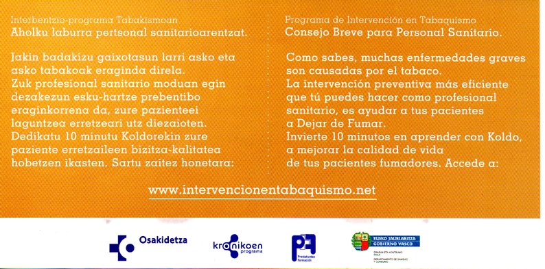 Hoy he recibido, junto con la nómina, este tarjetón a todo color ( un pastón, oiga) en el que se me anuncia una iniciativa 2.0 alineada con esto de la cronicidad y animándome como profesional a invertir 10 minutos para aprender, junto a un tal Koldo, a mejorar la calidad de vida de mis pacientes fumadores.