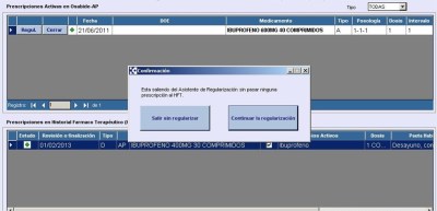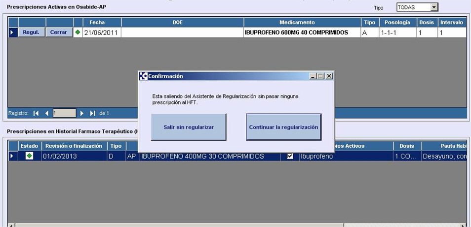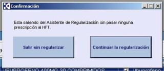 Este es una joya conceptual. En ocasiones has regularizado algún medicamento y no te deja salir de la regularización sin perder lo regularizado (Salir sin regularizar). La única solución es continuar con la regularización pero de mentiras, cerrando lo no regularizado, ya que si no lo haces no hay manera.