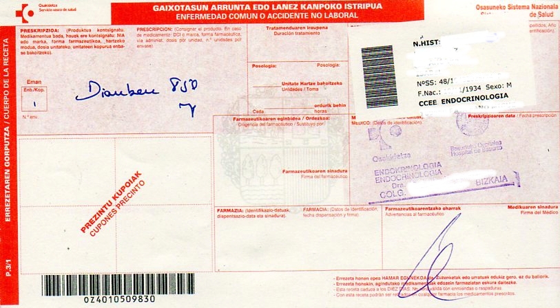 Esta receta que os enseño es de esta semana. A estas alturas de la película yo creía que había ya unos cuantos medicamentos que habían superado el concepto de marca. A día de hoy hablar de paracetamol, ibuprofeno, omeprazol y metformina (eso creía yo, tonto de mi), está tan extendido que todo el mundo tiene asumido lo que son y para que sirven al margen de marcas de fantasía. Pero mi endocrina de referencia sigue apostando por el Dianben. Que le vamos a hacer.