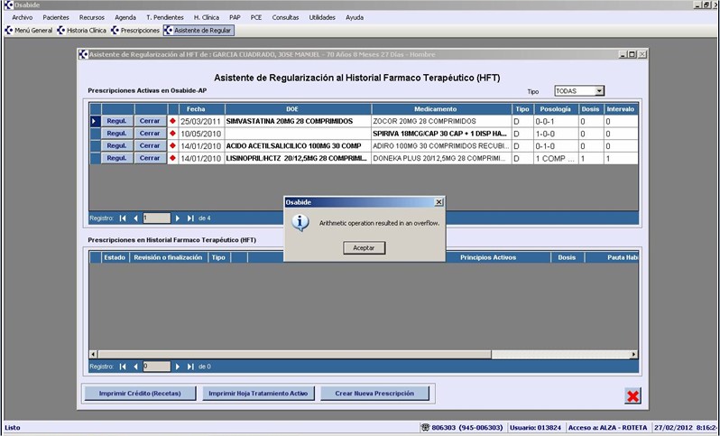 El problema del desbordamiento ocurre porque en la prescripción de ese medicamento en OsabideAP tiene como valores un cero en la Columna Dosis y otro Cero en la Columna Intervalo.