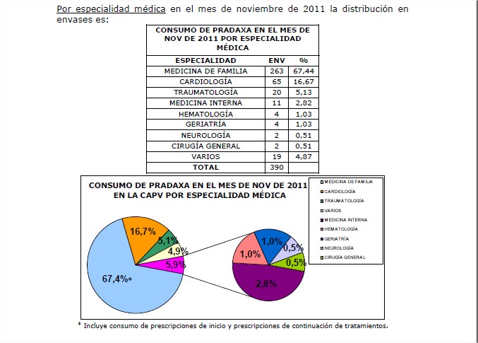 Me parto el bazo al leer este informe. Resulta que la especialidad que mas prescribe dabigatran en Euskadi es la Medicina de Familia y nada menos que en un 67%.
