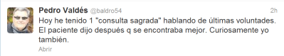 He leído este tweet de Pedro Valdés y me ha hecho cavilar sobre el tema. Comparto con él la sensación de lo importante que es para los ciudadanos este tema, reflexionar sobre ello, tomar decisiones y dar el paso de materializar el documento en el que queden plasmadas su Voluntades Anticipadas para que en caso de no poder manifestarlas de forma expresa, los profesionales sanitarios que le cuiden tomen decisiones acorde a sus deseos.
