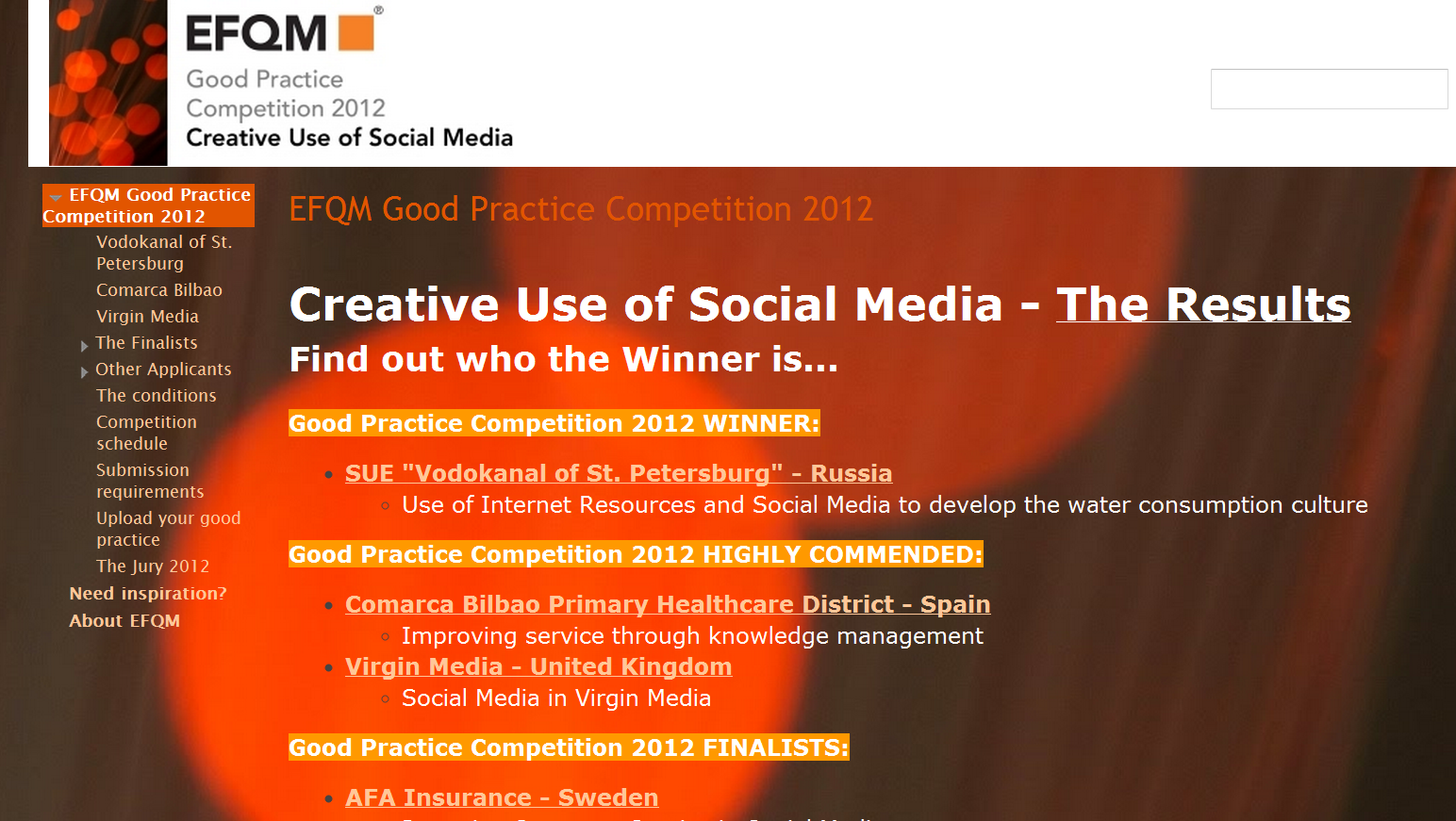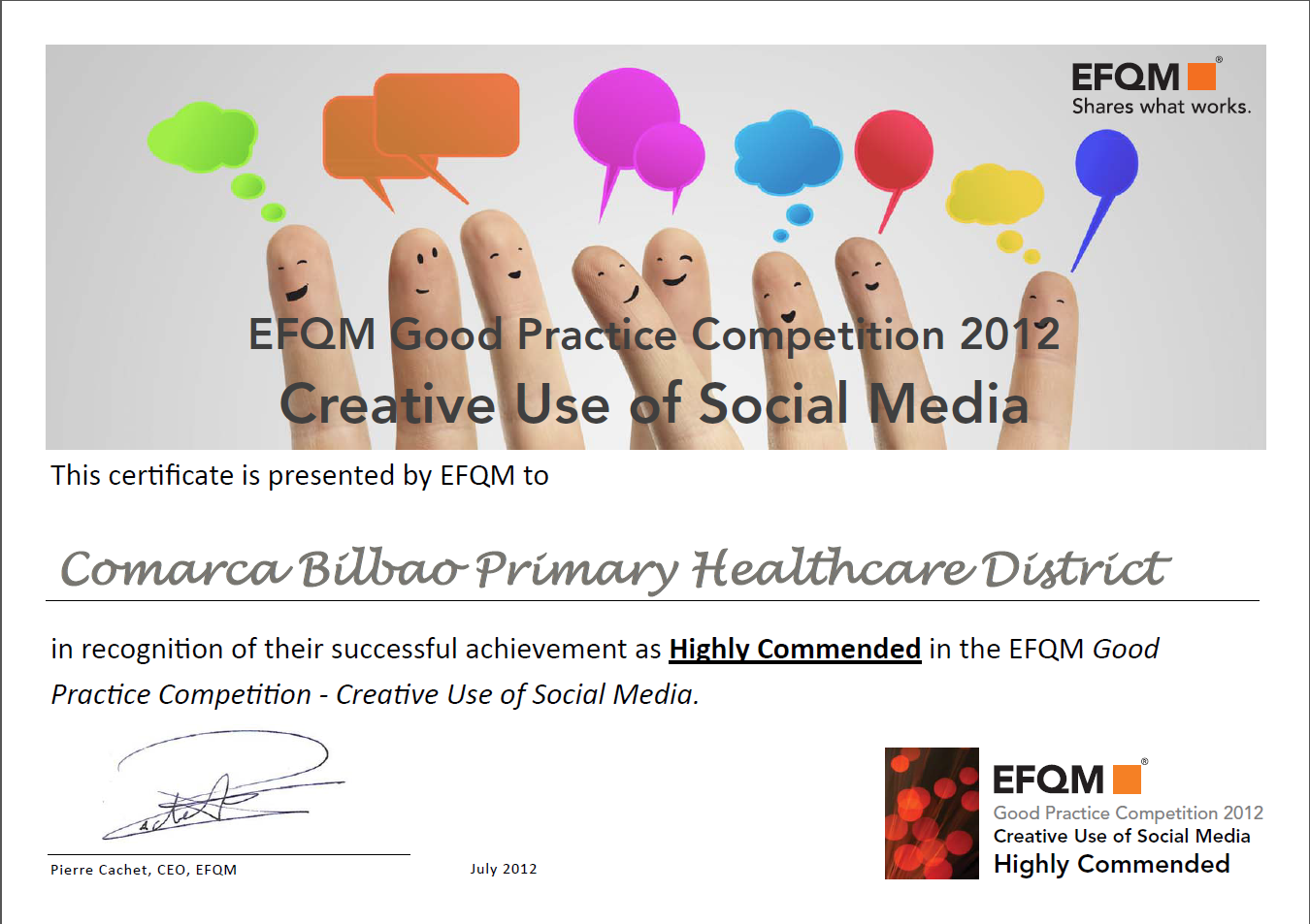 Ya conocéis que había sido elegida entre las 12 mejoras prácticas EFQM de 2012 en el uso creativo de los Medios de Comunicación Social. A mi, el mero hecho de esta seleccionada, me parecía la leche. Era como jugar la fase final de la Champions League.