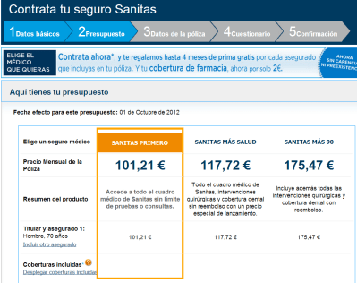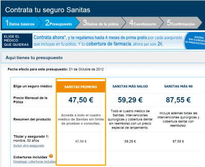 Pero la cosa se empieza a complicar si tienes 30 años, eres varón y vives en Bilbao. Ahora resulta que Sanitas te ofrecen pólizas que van desde los 35 €/mes la más básica hasta los 62,22 €/mes incluyendo cobertura dental