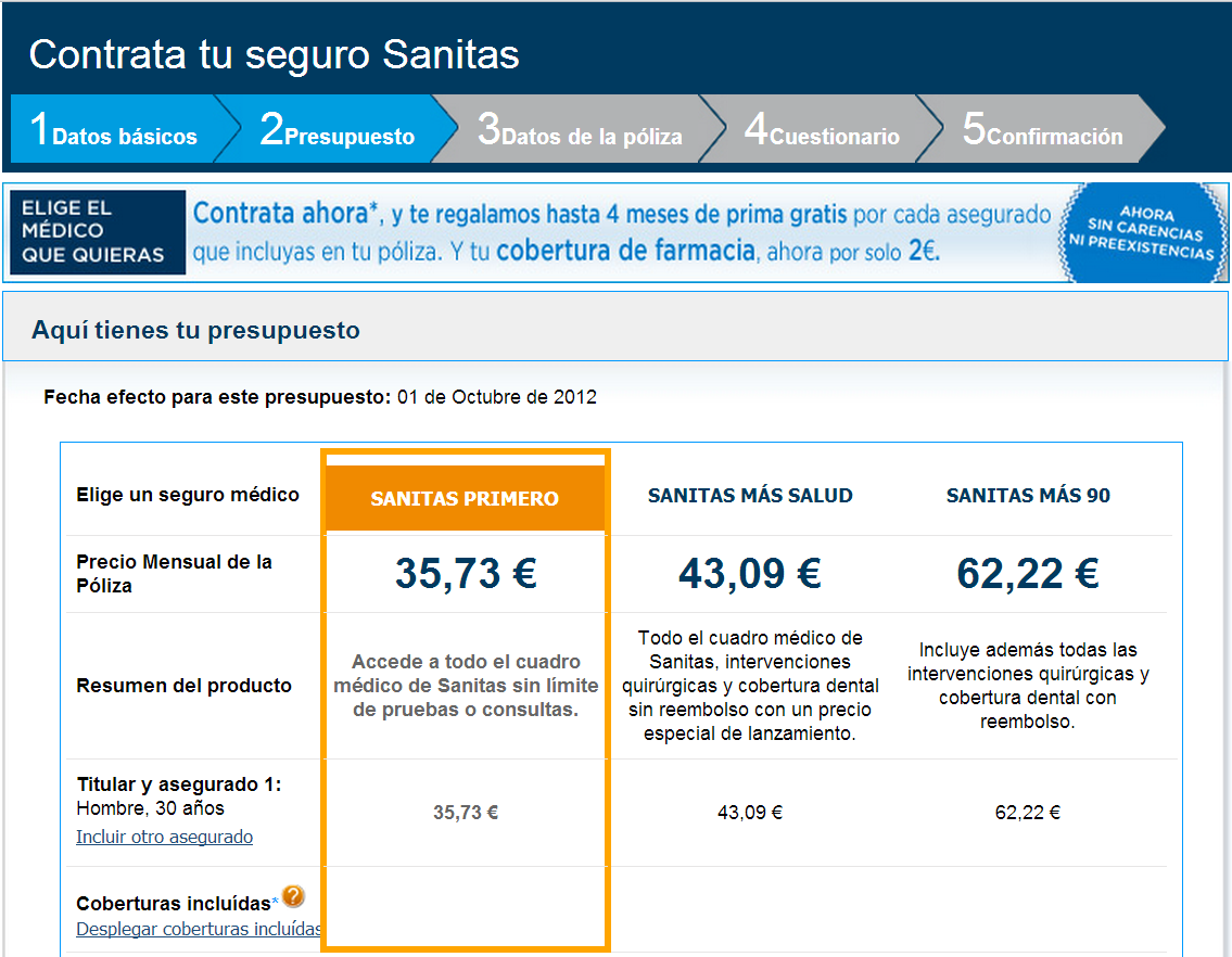 Pero la cosa se empieza a complicar si tienes 30 años, eres varón y vives en Bilbao. Ahora resulta que Sanitas te ofrecen pólizas que van desde los 35 €/mes la más básica hasta los 62,22 €/mes incluyendo cobertura dental