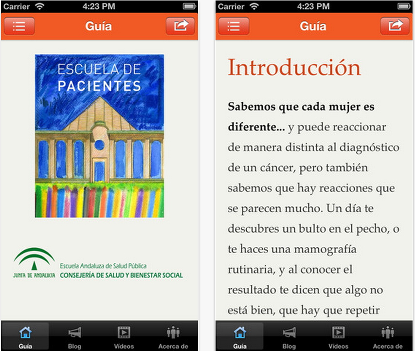 Nosotros desde la escuela de pacientes no hemos hecho ninguna app de autoexploración mamaria. Lo que hemos hecho es una app que auna la guía, los vídeos y el blog que tenemos en el aula de la escuela de pacientes. La app de la que se habla en la noticia de autoexploración mamaria la han realizado en el hospital de Rio Tinto en Huelva y fue comentada por la Consejera de Salud y Bienestar en la rueda de prensa en la que presentamos la nuestra y un video de consejos de maquillaje para mujeres en quimioterapia.