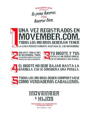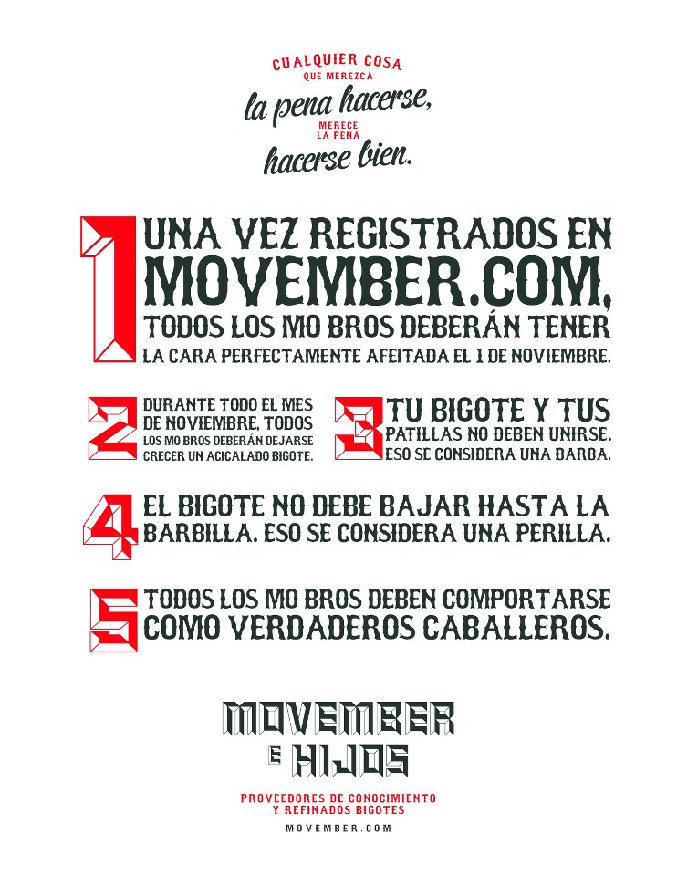 Movember es uno de esos inventos en favor de la concienciación, a la población general, sobre una patología. En esta ocasión nos toca a los varones y al cáncer de próstata. El invento consiste en una pijada de cortar. Hoy, te afeitas la cara y te la dejas como el culo de un niño y a partir de hoy te dejas bigote. Pero no cualquier bigote. Tiene sus normas