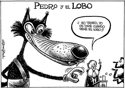 Según parece, el lobo no ha aprendido nada, nada. El del cuento termina mal, y este tambien. No se da cuenta de que mucha gente sin nada que perder es peligrosa; al final, se cargan al lobo. Tiempo al tiempo.Saludos