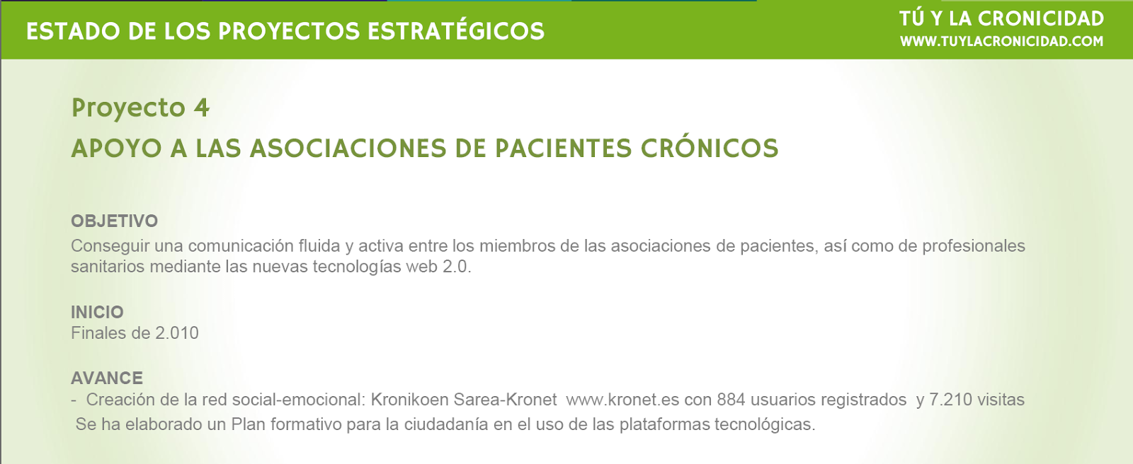 Partiendo de una idea base ya conocida como es un punto de encuentro en la red de pacientes con patologías crónicas se ha aportado un plus innovador como es poder superar el perfilado de los pacientes por su patologías y agruparlos por su situación anímica permitiendo interactuar a pacientes con patologías diferentes entre sí. El denominador común es estar enfermo y ser crónico, el objetivo es interactuar entre ellos (sin mamá medicina vigilándolo todo) y la pregunta antes de entrar es ¿cómo te encuentras hoy?. Kronikoen Sarea. Pero mejor lo cuentan ellos