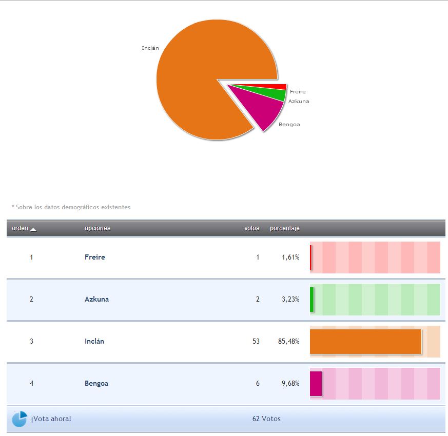 En este punto no parece que tengamos tanta dispersión. Para el 85,48% el premio limón se lo lleva Inclán.