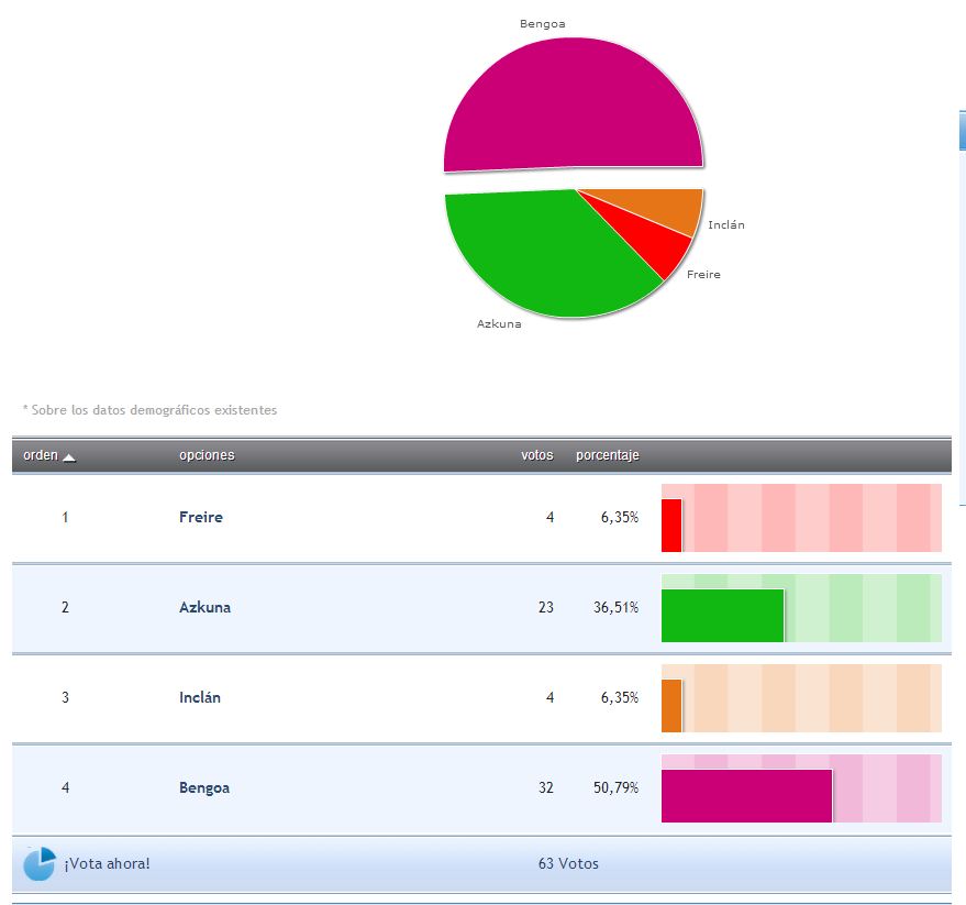 Sin entrar en detalle parece que hay división de opiniones. Para unos la labor de Bengoa ha supuesto un nuevo dimensionamiento de la marca Osaki en relación con los crónicos y para otros la labor de Azkuna merece ser la que se lleve el galardón. Lo que parece evidente es que tan solo para el 6,35%, este reconocimiento es para Inclán.