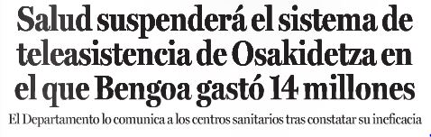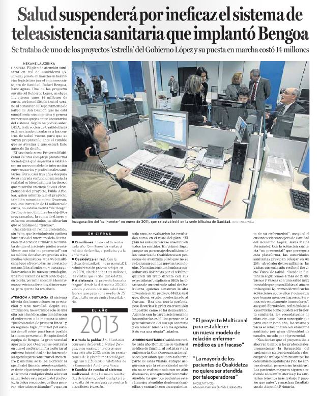 Resulta muy curiosa la cronología. El Consejero habla bien de Osarean. Incluso el lunes día 8 lo hace en la reunión de salud 2.0 de DeustoMartes: Se publica el artículo de Pérez GilMiércoles: Gran titular en primera página en DEIA criticando al Multicanal (¿es una noticia para primera página?Ese mismo día entrevista a Nuño en un tono muy crítico con el proyecto KSJueves: Comienzan las matizaciones: Parece que se centran en el sistema de citas IVRPero con todo esto el mombre Osarean y lo que engloba ha quedado tocado (de muerte? o sólo es una herida?A esperar acontecimientos