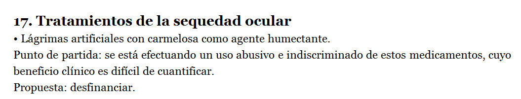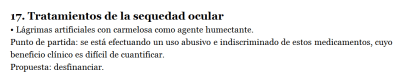 Y curiosamente los dos tienen razón. Lo que no dice la FADSP es que las patologías descritas no alcanzan ni el 5% de las personas que se humedecen el ojo cual cultivo de regadío. Así que habrá que encontrar un punto medio. Se financia previo informe que justifique su uso en indicación admitida y en dosis correcta.