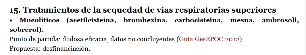 La acetilcisteína está indicada en procesos de fibrosis quística, pulmonar y EPOC y por ello su retirada de la financiación «debería ser discutida en todo caso ampliamente con las sociedades científicas implicadas, en especial la de medicina de familia y las de neumología.